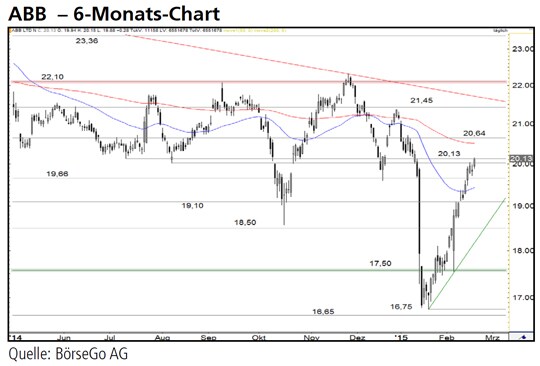 Ausblick: Die Aktien von ABB könnten die laufende Erholungsbewegung in den folgenden Tagen fortsetzen. Ein Ende des mittelfristigen Abwärtstrends ist dennoch aus unserer Sicht noch in weiter Ferne. Die Long-Szenarien: Auf dem aktuellen Niveau, knapp unter der 20,64 CHF-Marke, könnte es zunächst zu einer kurzen Pause innerhalb der Aufholjagd der Käuferseite kommen. Eine leichte Korrektur bis 19,10 CHF wäre denkbar, ehe sich der Aufwärtstrend mit einem Ausbruch über 20,13 CHF bis an die 20,64 CHF-Marke fortsetzen dürfte. Wird auch diese Hürde überschritten, sollten die Käufer den Widerstand bei 21,45 CHF und darüber bereits die zentrale Barriere bei 22,10 CHF attackieren. An dieser Stelle dürfte die Erholung jedoch stoppen und ein weiterer mehrwöchiger Kursrückgang einsetzen. Die Short-Szenarien: Fallen die Aktien dagegen unter 19,10 CHF zurück, würde die Kreuzunterstützung bei 18,50 CHF getestet. Dort könnten die Bullen den kurzfristigen Aufwärtstrend wieder aufnehmen. Ein Ausverkauf unter diese Marke wäre dagegen bearish zu werten. In diesem Fall wäre zudem auch die kurzfristige Aufwärtstrendlinie unterschritten und damit ein Verkaufssignal aktiv. Dies würde Abgaben bis 17,50 CHF und schliesslich bis 16,75 CHF nach sich ziehen.