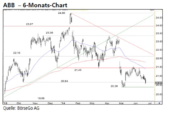 Ausblick: Die Aktien von ABB sind charttechnisch stark angeschlagen. Nur durch eine Verteidigung der Unterstützungszone von 20,38 bis 20,64 CHF könnte ein erneuter Einbruch verhindert werden. Die Short-Szenarien: Kurzfristig haben die Bullen die Chance, die Aktien ausgehend von der 20,64 CHFMarke über die Hürde bei 21,00 CHF an den markanten Widerstand bei 21,45 CHF anzutreiben. An dieser Stelle sollten sich jedoch wieder die Bären in das Geschehen einmischen und einen weiteren Ausverkauf initiieren. Wird in der Folge auch die Unterstützung bei 20,38 CHF durchbrochen, würde sich ein Abwärtsimpuls bis 19,66 CHF anschliessen. Darunter könnte bereits ein Einbruch bis 19,16 und 18,50 CHF drohen. Die Long-Szenarien: Erst ein nachhaltiger Anstieg über die Hürde bei 21,45 CHF würde derzeit für eine deutlichere Erholung sorgen. In diesem Fall könnten die Aktien von ABB bis an die übergeordnete Abwärtstrendlinie auf Höhe von 22,10 CHF haussieren. Ob dieser Kreuzwiderstand jedoch in Richtung 23,36 CHF durchbrochen werden kann, ist aktuell zu bezweifeln.