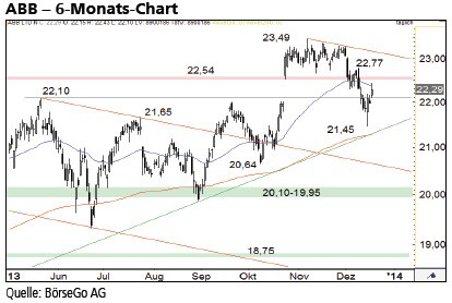 Ausblick: Die Konstellation in den Wochenkerzen deutet auf eine erneute Wende gen Norden und den Start eines weiteren Kaufimpulses hin. Allerdings ist der Weg gen Norden mit einigen Widerständen gespickt. Die Long-Szenarien: Eine schnelle Rückeroberung des horizontalen Widerstandes bei 22,54 CHF wie auch des Zwischenhochs bei 22,77 CHF wäre aus Bullensicht wünschenswert. Sollte dies gelingen, dürften die Aktien von ABB direkt Kurs auf das bisherige Jahreshoch bei 23,49 CHF nehmen. Sogar ein Test der massiven Widerstandsmarke bei 23,97 CHF erscheint im Anschluss möglich. Dort dürfte sich entscheiden, ob die Kraft auch für Kurse über 24,00 CHF und damit für ein langfristiges Kaufsignal in Richtung 28,04 CHF ausreichen wird. Die Short-Szenarien: Das Tief bei 21,45 CHF stellt zusammen mit dem EMA200 bei 21,28 CHF aktuell den entscheidenden kurzfristigen Unterstützungsbereich dar. Erst wenn der Wert darunter fällt, muss ein Ausverkauf in Richtung der Marke von 20,00 CHF befürchtet werden.
