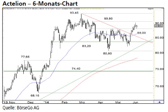 Ausblick: Mit dem Ausbruch aus der mehrwöchigen Konsolidierung haben sich die Bullen bei den Aktien von Actelion eindrucksvoll zurückgemeldet. Eine Fortsetzung dieser Kaufwelle könnte bereits einen Anstieg an das Allzeithoch auslösen. Die Long-Szenarien: Nach dem bullish zu wertenden Rücklauf an die 88,00 CHF-Marke sollte der Wert wieder Fahrt aufnehmen und die Barriere bei 90,80 CHF überschreiten. In der Folge wäre der Weg bis an die Rekordmarke bei 93,45 CHF frei. Sollte es den Bullen zudem gelingen auch diese Barriere zu überwinden, könnte eine Kaufwelle bis 98,00 und 100,00 CHF einsetzen. Die Short-Szenarien: Eine Korrekturausweitung unter die Haltemarke bei 88,00 CHF würde dagegen zunächst ohne grössere Folgen bleiben und könnte bereits bei 85,00 CHF enden. Im Anschluss an eine Bodenbildung dürfte sich eine weitere Aufwärtsbewegung entwickeln. Doch selbst ein Rücksetzer an die Unterstützung bei 83,20 CHF würde den aktuellen Anstieg nicht in Frage stellen. Erst ein Bruch dieser Marke dürfte stärkere Abgaben bis 80,60 und 77,65 CHF auslösen.