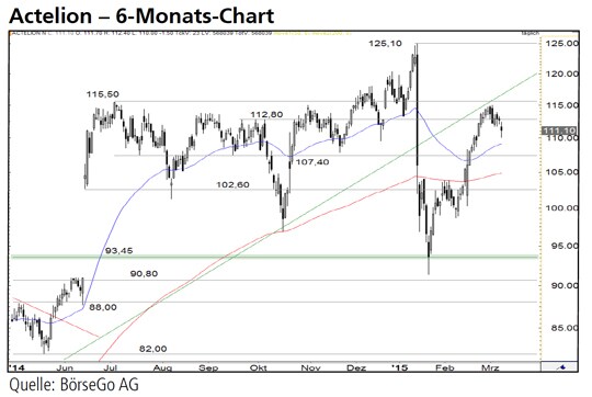Rückblick: Im Rahmen ihres langfristigen Aufwärtstrends stiegen die Aktien von Actelion im Juni 2014 auf 115,50 CHF an und tendierten im Anschluss über Monate seitwärts.