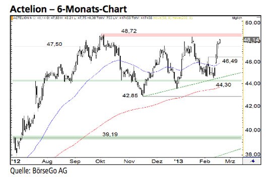 Augenscheinlich bereiten die Bullen den nächsten Ausbruchsversuch über das Verlaufshoch vom Oktober vor. Vor allem die Aufwärtsdynamik des laufenden Kaufimpulses legt nahe, dass ihnen dieses Unterfangen glücken könnte. Die Long-Szenarien: Oberhalb von 47,50 CHF könnten die Aktien von Actelion direkt bis 48,72 CHF ansteigen. Ein nachhaltiger Ausbruch über diesen starken Widerstand würde den mehrwöchigen Seitwärtsmarkt beenden und ein übergeordnetes Kaufsignal generieren. Entsprechend könnte man einen Ausbruch über 48,72 CHF „long“ handeln. In der Folge könnten die Aktien bis 51,00 CHF haussieren. Oberhalb dieser Marke könnte sich die Rally bereits bis 53,40 und 54,00 CHF ausdehnen. Die Short-Szenarien: Ein Rückgang unter 46,49 CHF hätte dagegen einen direkten Rückfall an die Unterseite des Dreiecks bei 44,30 CHF zur Folge. Hier könnte sich ein weiterer Anstieg anschliessen, doch hätte sich das Chartbild in diesem Fall deutlich eingetrübt. Entsprechend bearish wäre ein Ausverkauf unter 44,30 CHF zu werten. Kurzfristig könnte die 42,85 CHF- Marke zwar zu einer Erholung genutzt werden, mittelfristig dürften jedoch Abgaben bis 39,19 CHF folgen.