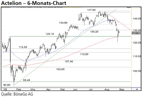 Ausblick: Die Aktien von Actelion haben sich erfolgreich gegen weitere Abgaben zur Wehr gesetzt. Setzt sich die Erholung jetzt fort, würde das Allzeithoch wieder in greifbare Nähe rücken. Die Long-Szenarien: Zunächst müssen die Bullen im Rahmen der laufenden Erholung jedoch den Widerstand bei 130,20 CHF aus dem Weg räumen. Gelingt ihnen der Anstieg über die Marke, käme es zu einem Aufwärtsimpuls bis an die Hürde bei 134,90 CHF. Diese letzte Barriere vor der Rekordmarke dürfte hart umkämpft sein. Wird sie in der Folge ebenfalls überwunden, könnte die Kaufwelle bis 147,00 CHF führen. Ein Anstieg über das Rekordhoch würde ein mittelfristiges, rechnerisches Kursziel bei 155,00 CHF aktivieren. Die Short- Szenarien: Fallen die Aktien dagegen im weiteren Verlauf unter die Unterstützung bei 125,10 CHF zurück, würde der Wert wieder in Bedrängnis geraten und an die 120,00 CHFMarke einbrechen. Hier könnte eine Bodenbildung beginnen, der ein weiterer Anstieg folgen dürfte. Ein Ausverkauf unter die Marke würde dagegen ein kleines Verkaufssignal auslösen und mittelfristige Abgaben bis 114,40 CHF und 112,80 CHF nach sich ziehen.