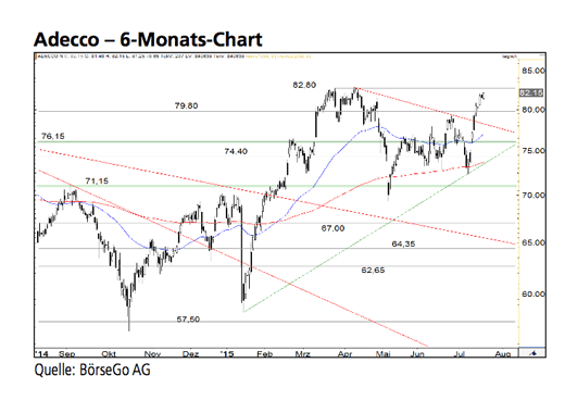 Nachdem die Aktien von Adecco im März 2014 ein neues Rallyhoch bei 79,80 CHF erreicht hatten, ging der Wert in einen ausgeprägten Abwärtstrend über, der in der Spitze bis 56,60 CHF führte.
