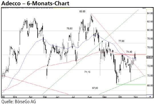Ausblick: Die Aktien von Adecco haben eine markante Barriere erreicht. Deren Bruch würde jetzt zu einem mittelfristigen Kaufsignal führen. Die Long-Szenarien: Nach einer leichten Korrektur bis an die 72,00 CHF-Marke dürften die Bullen die Gunst der Stunde nutzen und den Wert über die Barriere bei 74,40 CHF kaufen. Dieses bullishe Signal sollte für Auftrieb und einen Anstieg bis 77,00 und darüber bis an die Hürde bei 79,80 CHF sorgen. An dieser Stelle könnten Gewinnmitnahmen eine mehrtägige Gegenbewegung auslösen. Ein anschliessender Ausbruch über die 79,80 CHF-Marke würde ein weiteres Kaufsignal ausbilden und zu einem Angriff auf die 83,95 CHF-Marke führen können. Die Short-Szenarien: Scheitern die Aktien dagegen an der 74,40 CHF-Marke und setzen im weiteren Verlauf unter die wichtige Unterstützung bei 71,15 CHF zurück, wäre die Erholungsphase beendet. In diesem Fall dürfte es zu einer Abwärtsbewegung bis 68,00 CHF kommen. Selbst eine Ausweitung der Korrektur bis 67,00 CHF und darunter bis an die 65,00 CHF-Marke wäre in der Folge möglich.