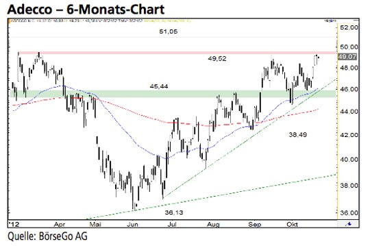 Sollte den Bullen der Ausbruch über 49,52 CHF auf Tagesschlusskursbasis gelingen, könnte der Wert endgültig den Seitwärtsmarkt der letzten beiden Jahre nach oben durchbrechen. Die Long-Szenarien: Oberhalb von 48,00 CHF bestehen gute Chancen, dass es den Käufern gelingt, den Widerstand bei 49,52 CHF zu durchbrechen. In der Folge dieses Kaufsignals dürfte der Wert rasch bis 51,05 CHF ansteigen. Oberhalb dieser Marke könnte sich die Kaufwelle bereits bis 54,00 CHF fortsetzen. Kann auch dieser Bereich überschrit- ten werden, sind mittelfristig Zugewinne bis 57,05 CHF wahr- scheinlich. Die Short-Szenarien: Derzeit würde erst ein Bruch der mittelfristigen Aufwärtstrendlinie, die aktuell auf Höhe der Unterstützung bei 47,20 CHF verläuft, für eine grössere Kor- rektur sprechen. In diesem Fall dürften die Aktien direkt bis zur wichtigen Haltemarke bei 45,44 CHF fallen. Von dort aus könnte jedoch ein weiterer Ausbruchsversuch über die 49,52 CHF-Marke beginnen. Sollte die Unterstützung bei 45,44 CHF dagegen nachhaltig durchbrochen werden, würde dies für einen Wiedereintritt in den vorangegangenen Seitwärtsmarkt sprechen. Verluste bis 38,49 CHF wären die Folge.