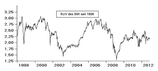 Derselbe Tatbestand ergibt sich auch aus der historischen Betrachtung des Kurs-Umsatz-Verhältnisses beim SMI. Die Börsenbewertung beim SMI entspricht derzeit dem 2,2-fachen Jahresumsatz. Zugegeben: Es hat in der Vergangenheit auch schon wesentlich niedrigere Werte gegeben. Aber wie die Graphik zeigt, ist das derzeitige Niveau nicht überhöht. Das gilt noch mehr, wenn wir nicht nur die 20 SMI-Aktien betrachten, sondern den breiten Markt, der nur mit dem 1,09-fachen Jahresumsatz bewertet wird. Das mittlere Kurs-Gewinn-Verhältnis liegt für die 60 wichtigsten Schweizer Aktien bei 16. Auch das ist nicht zu hoch, wenn man bedenkt, wie viele exportorientierte Unternehmen sich mit dem überbewerteten Schweizer Franken immer noch schwertun.