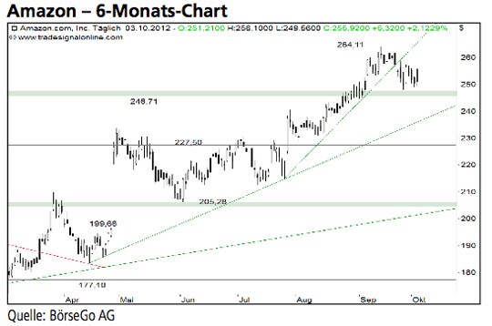 Die laufende Korrekturphase ist aus unserer Sicht als bullisher Rücklauf an die Ausbruchsmarke zu werten und dürfte derzeit verstärkt neue Käufer anlocken. Die Long-Szenarien: Verbleiben die Aktien von Amazon oberhalb von 246,71 USD, kann es zu einem weiteren Anstieg bis an den kurzfristigen Widerstand bei 257,40 USD kommen. Ein Ausbruch über diese Hürde dürfte zu einer Kaufwelle an das neue Allzeithoch bei 264,11 USD führen. Sollte auch diese Marke dem Ansturm der Bullen zum Opfer fallen, könnte sich der Aufwärtstrend bis 273,00 USD und darüber auf 283,00 USD ausdehnen. Die Short-Szenarien: Eine Fortsetzung der Korrektur würde dagegen durch einen Rückfall unter 246,71 USD auf Tagesschlusskursbasis ausgelöst. In diesem Fall wäre zunächst mit Abgaben bis 233,84 USD zu rechnen. Von dort aus könnte sich der Aufwärtstrend bereits fortsetzen. Würde diese Unterstützung hingegen ebenfalls unterschritten, könnte die Gegenbewegung bis 227,50 USD führen. Doch erst der Bruch dieser markanten Haltemarke würde für das vorübergehende Ende der laufenden Rally sprechen.