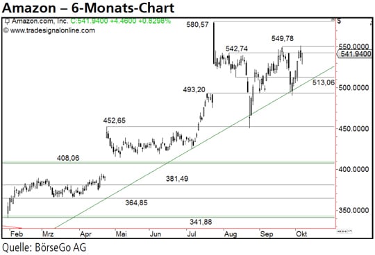 Ausblick: Die Aktien von Amazon trotzen dem schwächeren Marktumfeld und zeigen sich beeindruckend stabil. Ein Anstieg an das Allzeithoch dürfte aus unserer Sicht in Kürze erfolgen. Die Long-Szenarien: Derzeit stellt sich dem Ansturm der Bullen nur noch der Widerstandsbereich von 542,74 bis 549,78 USD in den Weg. Ein Ausbruch über diese Barriere auf Tagesschlusskursbasis würde für eine Aufwärtsbewegung bis an das Rekordhoch bei 580,57 USD sorgen. Dort könnten Gewinnmitnahmen einsetzen und eine Korrektur auslösen. Kann anschliessend jedoch auch das Allzeithoch überschritten werden, käme es zu einer Ausweitung der Rally bis an die 600,00 USD-Marke. Auf Sicht einiger Wochen hätten die Aktien bei einem Anstieg über dieses charttechnische Kursziel sogar Aufwärtspotenzial bis 625,00 USD. Die Short-Szenarien: Sollten die Käufer dagegen zunächst an der 549,78 USD-Marke scheitern, wäre eine leichte Korrektur bis 520,00 USD und darunter gegebenenfalls bis 513,06 USD einzuplanen. Spätestens an dieser soliden Unterstützung hätten die Bullen abermals die Gelegenheit, die Kaufwelle der letzten Tage fortzusetzen. Wird diese Marke dagegen durchbrochen, wäre ein kurzfristiges Verkaufssignal aktiviert. In diesem Fall dürfte der Wert bis 493,20 USD und darunter bis auf 475,00 USD zurückfallen.