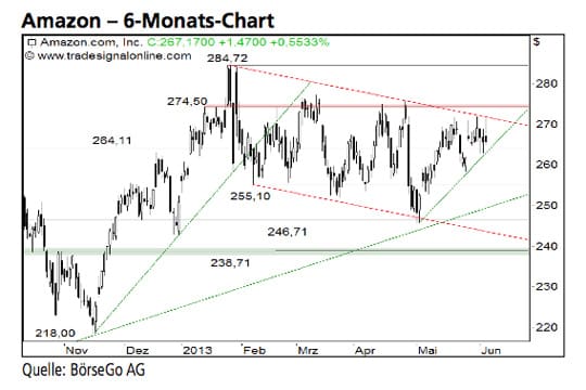 Übergeordnet befinden sich die Aktien von Amazon in einer Korrekturphase, die sich als bullishe Flagge klassifizieren lässt. Ein Ausbruch aus dieser Formation würde ein mittelfristiges Kaufsignal generieren. Die Long-Szenarien: Gelingt es den Bullen die aktuelle Aufwärtsdynamik aufrechtzuerhalten und die Widerstandsmarke bei 274,50 USD zu durchbrechen, wäre die Flagge ebenfalls aufgelöst. In der Folge dürfte der Wert bis 284,72 USD ansteigen. Ein Ausbruch über das Allzeit- hoch würde zunächst eine weitere Kaufwelle bis 300,00 USD auslösen. Auf mittlere Sicht könnten die Aktien oberhalb dieses Zielbereiches bis 315,00 und 325,00 USD ansteigen. Die Short-Szenarien: Sollte der beschriebene Ausbruchsversuch im ersten Anlauf nicht gelingen, könnte es ausgehend von der Unterstützung bei 258,34 USD zu einem zweiten Angriff auf die 274,50 USD-Marke kommen. Werden die Aktien von Amazon hingegen unter die 258,34 USD-Marke ausverkauft, wären weitere Verluste bis 255,10 USD zu erwarten, die sich bei einem Bruch der Marke bis 246,71 USD fortsetzen würden.