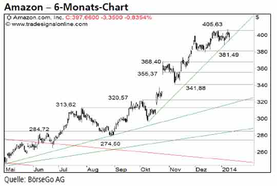 Rückblick: Seit dem Ausbruch aus einer bullishen Flagge im Juni 2013 sind die Aktien von Amazon kaum mehr zu bremsen:...