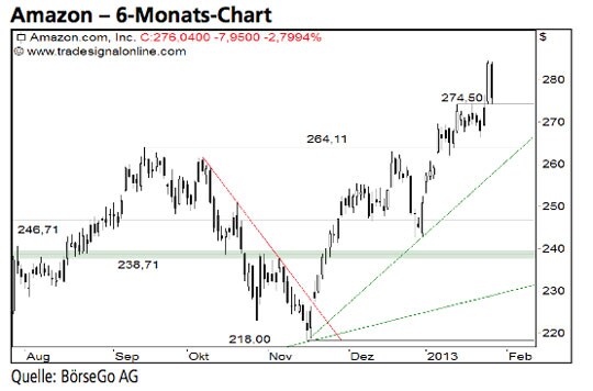 Die Bullen haben das Ruder bei den Aktien von Amazon weiter fest in der Hand und könnten die Hausse der letzten Wochen mit einem Ausbruch über 284,72 USD direkt weiter fortsetzen. Die Long-Szenarien: Verbleibt der Wert oberhalb der kleinen Unterstützung bei 274,50 USD, könnte es umgehend zu einem Anstieg über 284,72 USD kommen. Anschliessend könnte der Wert bereits bis 293,00 und 300,00 USD ansteigen. Sollte auch diese Marke überschritten werden, dürfte sich die Kursrally weiter bis 315,00 USD ausdehnen. Entsprechend könnte man einen Anstieg über 284,72 USD auf Tagesschlusskursbasis mit einem Long-Engagement handeln. Die Short-Szenarien: Bei einem Rückfall unter 274,50 USD wäre der aktuelle Anstieg dagegen kurzfristig unterbrochen und eine leichte Korrektur bis 264,11 USD wahrscheinlich. Allerdings dürften die Bullen an dieser Stelle wieder aktiv wer- den und einen weiteren Aufwärtsimpuls auslösen. Würde das frühere Allzeithoch dagegen nachhaltig unterschritten, dürfte es zu einem Test der kurzfristigen Aufwärtstrendlinie auf Höhe von 258,00 USD kommen.