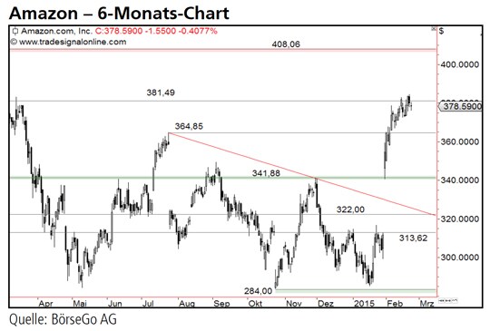 Rückblick: Das Jahr 2014 begann bei den Aktien von Amazon noch höchst bullish, denn der Wert markierte ein neues Allzeithoch bei 408,06 USD.