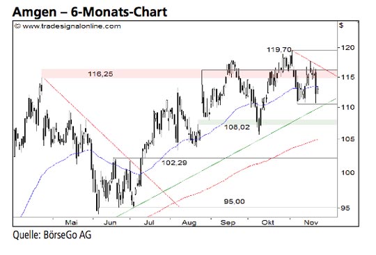Die Aktien von Amgen bilden derzeit ein absteigen- des Dreieck aus. Diese Formation deutet eine baldige Rich- tungsentscheidung an, die aus unserer Sicht zu Gunsten der Bullen ausfallen dürfte. Die Long-Szenarien: Sollten die Aktien jetzt oberhalb der Haltemarke bei 110,65 USD verbleiben, dürfte es zu einem Angriff auf den Widerstand bei 116,25 USD kommen. Ein erfolgreicher Ausbruch über die Marke hätte einen direkten Anstieg bis 119,79 und darüber bis 125,00 USD zur Folge. Auf mittlere Sicht würde ein Ausbruch über das aktuelle Allzeithoch Aufwärtspotenzial bis 135,00 USD generieren. Die Short-Szenarien: Setzt der Wert dagegen unter die Unterstützung bei 110,65 USD zurück, dürfte es zu einem Test der wichtigen Haltemarke bei 108,02 USD kommen. An dieser Stelle dürften die Käufer wieder aktiv werden und die Aktien von Amgen in Richtung des Rekordhochs antreiben. Ein Unterschreiten der Haltemarke hätte dagegen ein Verkaufssignal mit einem ersten Ziel bei 102,29 USD zur Folge.