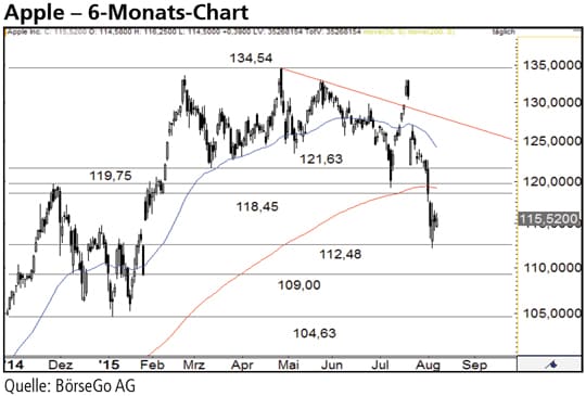 Ausblick: Die Kursentwicklung der vergangenen Wochen hat das mittelfristige Chartbild bei dem Dow Jones-Schwergewicht eingetrübt. Eine technische Gegenreaktion auf die schnellen Kursverluste ist allerdings kurzfristig denkbar. Die Short-Szenarien: Die unterschrittenen Unterstützungen dienen von jetzt an als Widerstände. Das heisst, im Falle einer Gegenbewegung zur Oberseite wäre bei 118,45, 119,75 und 121,63 USD mit Widerstand zu rechnen. In diesem engen Kursband dürften die Verkäufer wieder ihre Chance wittern und könnten dem Wert erneut Abgaben bis auf die Unterstützung bei 112,48 USD bescheren. Sollte auch diese Marke dem Verkaufsdruck nicht standhalten, würde sich die Abwärtsbewegung aller Voraussicht nach verschärfen. Das nächste Abwärtsziel wäre bei 109,00 USD auszumachen. Auch das Jahrestief bei 104,63 USD wäre dann nicht mehr entfernt. Die Long-Szenarien: Die Käufer haben aktuell noch das Nachsehen. Erst wenn die Aktien von Apple wieder die Widerstände bis hinauf auf 121,63 USD zurückerobern, hätten sie das Verkaufssignal im Tageschart negiert. Eine Erholung bis an die Unterkante der Kurslücke vom 22. Juli bei 125,06 USD wäre im Anschluss möglich. Ein langfristiges Kaufsignal wäre über 134,54 USD aktiv.