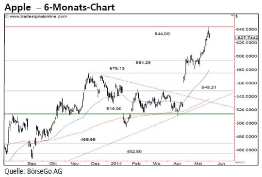 Ausblick: Die Kaufwelle seit Mitte April unterstreicht die derzeit phänomenale Verfassung der Bullen. Ein weiterer Ausbruch könnte jetzt bereits zu einem Angriff auf das Allzeithoch führen. Die Long-Szenarien: Sollten die Aktien von Apple auch über die Barriere bei 644,00 USD ansteigen, dürfte sich die laufende Rally unvermindert dynamisch fortsetzen. Zunächst sollte die kleinere Hürde bei 675,00 USD erreicht werden. Wird diese Marke im weiteren Verlauf ebenfalls durchbrochen, stünde als nächstes Ziel das Allzeithoch bei 705,07 USD auf der Agenda der Käuferseite. Selbst ein Ausbruch über dieses Preisniveau wäre aufgrund der aktuellen Trendstärke möglich und würde Potenzial bis 725,00 USD eröffnen. Die Short-Szenarien: Sollte es den Bullen dagegen nicht gelingen, die 644,00 USD-Marke im ersten Anlauf zu überwinden, könnte eine leichte Korrektur bis 607,00 USD einsetzen. An dieser Stelle dürfte es jedoch bereits zur Fortsetzung der Rally kommen. Fällt der Wert dagegen deutlicher unter die Unterstützung zurück, würde die ehemalige Hürde bei 594,25 USD ein weiteres Mal getestet.