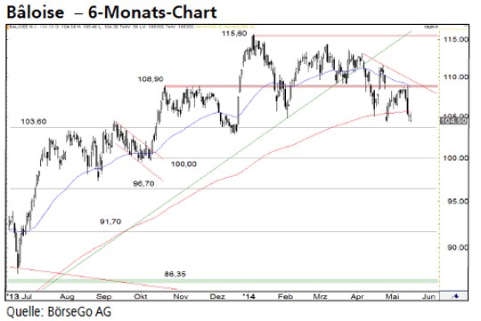 Rückblick: Die Aktien von Bâloise stiegen in einer gewaltigen Kaufwelle seit Juni des vergangenen Jahres dynamisch an und liessen dabei die langfristigen Kurshürden bei 96,70 und 103,60 CHF hinter sich.