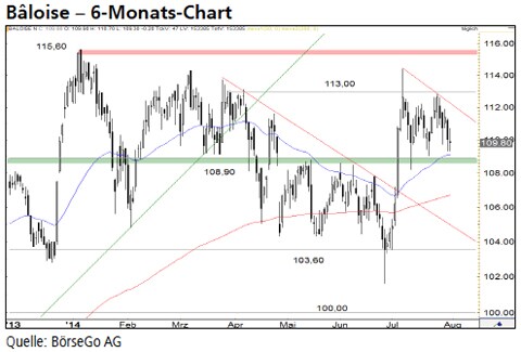Ausblick: Aktuell wird der Aufwärtsimpuls von Anfang Juli korrigiert. Die Fortsetzung dieses Anstiegs dürfte jedoch nicht mehr lange auf sich warten lassen. Die Long-Szenarien: Ausgehend von der Unterstützung bei 108,90 CHF sollten die Bullen die Aktien von Bâloise wieder an den Bereich um 113,00 CHF antreiben. Bei einem Ausbruch über diese Hürde wäre ein Kaufsignal gebildet, dass zu einem Anstieg über das Verlaufshoch bei 115,60 CHF führen dürfte. Anschliessend könnte der Wert kurzfristig bis 120,00 CHF ansteigen. Auf mittlere Sicht wäre eine Rallyausweitung bis 125,00 CHF zu erwarten. Die Short-Szenarien: Brechen die Aktien dagegen nachhaltig unter die 108,90 CHF-Marke ein, käme es zu einer leichten Korrektur bis 105,50 CHF. Dort sollte sich eine zweite Kaufwelle anschliessen. Kann die Unterstützung dagegen nicht für einen weiteren Anstieg genutzt werden, wäre ein Rückfall bis zur zentralen Haltemarke bei 103,60 CHF wahrscheinlich.