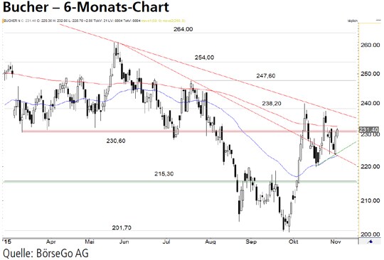 Rückblick: Mit einem kleinen, kurzfristigen Doppelboden an der langfristigen Unterstützung bei 201,70 CHF beendeten die Aktien von Bucher Ende September vorerst ihren mittelfristigen Abwärtstrend.
