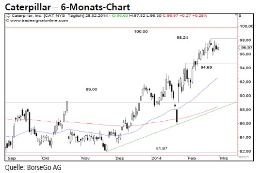 Ausblick: Aktuell konsolidiert der Wert diese Kaufwelle in einer kurzfristigen symmetrischen Dreiecksformation. Diese spricht für eine baldige Fortsetzung des Aufwärtstrends. Die Long-Szenarien: Können die Aktien von Caterpillar über das Zwischenhoch bei 98,24 USD ausbrechen, dürfte es zu einem Anstieg bis an die zentrale Barriere bei 100,00 USD kommen. Dort wäre zunächst mit einer leichten Korrektur zu rechnen. Kann der Wert im Anschluss über die Hürde ausbrechen, sollte es zu einer Kaufwelle bis 104,00 USD kommen. Auf mittlere Sicht könnten die Aktien anschliessend weiter bis 110,00 USD haussieren. Die Short-Szenarien: Sollte der Anstieg dagegen jetzt etwas abgebremst werden und der Ausbruch über 98,24 USD nicht direkt erfolgen, kann eine Korrektur bis 94,69 USD einsetzen. An dieser Stelle dürften die Bullen wieder in das Geschehen eingreifen und einen weiteren Kaufimpuls auslösen. Wird diese Unterstützung dagegen durchbrochen, wäre ein erstes negatives Signal aktiv. In der Folge dürften die Aktien von Caterpillar innerhalb einer mehrtägigen Abwärtsbewegung bis in den Bereich der Haltemarke bei 89,00 USD fallen.