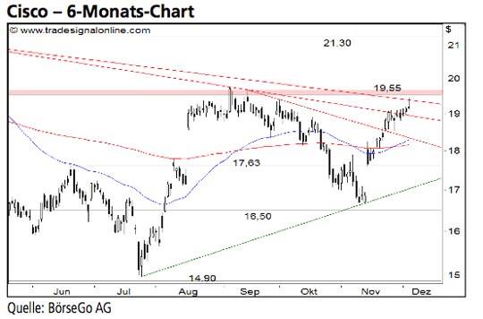 Der kurzfristige Aufwärtstrend der Aktien von Cisco ist an Dynamik kaum mehr zu überbieten und die Wahr- scheinlichkeit für einen Ausbruch über die nahegelegenen Widerstandsmarken damit stark erhöht. Die Long-Szenarien: Zunächst dürften die Aktien bis an das Widerstandscluster von 19,55 bis 19,75 USD ansteigen. Ein Ausbruch über diese Barriere würde entsprechend ein mittelfristiges Kaufsignal und einen Aufwärtsimpuls bis 20,30 USD einleiten. Oberhalb dieses kleinen Widerstands könnte sich die Hausse direkt bis 21,30 USD fortsetzen. Darüber stünde bereits die Kurshürde bei 22,34 USD auf der Agenda. Die Short-Szenarien: Setzt der Wert dagegen unter die gebrochene Abwärtstrendlinie zu- rück, könnte ein weiterer Ausbruchsversuch von 18,25 USD aus einsetzen. Misslingt dort eine Stabilisierung, sind weitere kurzfristige Verluste bis 17,63 USD denkbar. Allerdings könnte die dort verlaufende Aufwärtstrendlinie Käufer anlocken und eine Bodenbildung nach sich ziehen. Erst bei einem Bruch dieser Unterstützung wäre der jüngste Kaufimpuls neutralisiert und Verluste bis 16,50 USD die Folge.