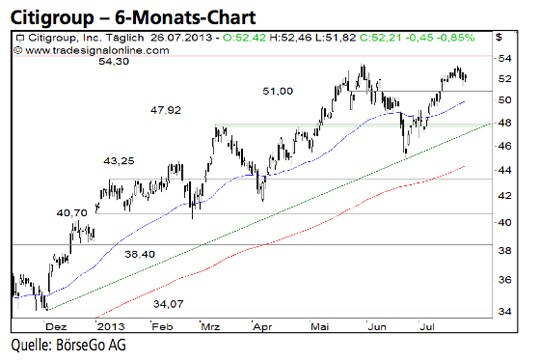 Der Anstieg der letzten Wochen hat zur Überwindung der Korrekturphase geführt und dürfte den Aktien von Citigroup nach unserer Auffassung neuen Auftrieb verleihen. Selbst ein Ausbruch über den massiven Widerstand bei 54,30 USD ist aktuell möglich. Die Long-Szenarien: Nach einer kurzfristigen Seitwärtsphase oberhalb der 51,00 USD-Marke dürften die Bullen die Kurshürde bei 54,30 USD in Angriff nehmen. Sollte ein Ausbruch über diese Barriere auf Tagesschlusskursbasis erfolgen, wäre ein langfristiges Kaufsignal gebildet, das man entsprechend mit einem Long-Engagement handeln könnte. Kurzfristig dürfte der Wert in einer Kaufwelle bis an die 58,00 USD-Marke ansteigen. Nach einer leichten Korrektur sollte sich der Aufwärtstrend oberhalb von 58,00 USD zunächst bis 61,50 USD und darüber bereits bis 65,00 USD ausdehnen. Schliesslich könnte sogar die 70,00 USD-Marke erreicht werden. Die Short-Szenarien: Sollten die Bullen dagegen an der starken Hürde bei 54,30 USD scheitern und der Wert anschliessend unter 51,00 USD ausverkauft werden, wäre dies ein Zeichen für eine kurzfristige Korrektur. In der Folge wäre damit zu rechnen, dass die Aktien bis an die solide Kreuzunterstützung bei 47,92 USD zurücksetzen. Von dort aus könnte es zu einer weiteren Kaufwelle kommen. Ein Bruch der Marke hätte dagegen Verluste bis 45,00 USD zur Folge.