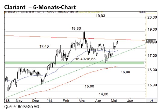 Ausblick: Die seit März laufende Konsolidierung weist eine bullishe Struktur auf und sollte regelkonform nach oben hin verlassen werden. Neue Verlaufshochs würden auch im langfristigen Bild ein starkes Kaufsignal generieren. Die Long- Szenarien: Die markante Abwärtstrendlinie verläuft aktuell im Kursbereich im 18,20 CHF. Sie gilt es aus Bullensicht zu überwinden, um sich weiteren Aufwärtsspielraum zu verschaffen. Das nächste Trendziel auf der Oberseite würde in diesem Fall das Jahreshoch bei 18,83 CHF darstellen. Kurse über 18,83 CHF wiederum wären sehr positiv zu werten. Erst am Mehrjahreshoch bei 19,93 CHF wäre anschliessend mit deutlicher Gegenwehr der Bären zu rechnen. Die Short-Szenarien: Auch ein nochmaliger Abpraller an der Abwärtstrendlinie muss aufgrund ihrer Relevanz einkalkuliert werden. Ein darauffolgender Rücksetzer würde bei 17,43 und 16,50 CHF auf Unterstützungen treffen. Kurse deutlich unter der letztgenannten Marke könnten eine mittelfristige Umkehr im Chart bewirken mit der Aufwärtstrendlinie bei 14,00 CHF als möglichem Ziel.