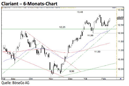 Nach der erfolgreichen Verteidigung der 11,98 CHF-Marke haben es die Käufer derzeit in der Hand, mit einem Ausbruch über 13,48 CHF den mittlerweile über ein Jahr andauernden Seitwärtsmarkt der Aktien von Clariant zu beenden. Die Long-Szenarien: Zunächst dürfte der Wert bis 13,25 CHF ansteigen und oberhalb der Marke zu einem Angriff auf die Hürde bei 13,48 CHF ansetzen. Wird diese Barriere durchbrochen, wäre ein mittelfristiges Kaufsignal aktiv, welches man entsprechend „long“ handeln könnte. In der Folge dürfte der Wert zügig bis 14,29 CHF ansteigen. Oberhalb dieses Widerstands hätten die Aktien weiteres Potential bis 15,50 CHF. Die Short-Szenarien: Ein Rücksetzer vom aktuellen Niveau unter 12,43 CHF würde dagegen eine leichte Korrektur bis 11,98 CHF auslösen. In der aktuell stark bullishen Verfassung des Wertes wäre erst ein deutlicher Ausverkauf unter diese Unterstützung als Zeichen für eine stärkere Trendwende zu sehen. In diesem Fall würde zudem die tragende, mittelfristige Aufwärtstrendlinie durchbrochen und ein erster Kursrutsch bis 11,00 CHF wahrscheinlich. An dieser Stelle könnte es jedoch zu einer Stabilisierung und einem erneuten Anstieg kommen