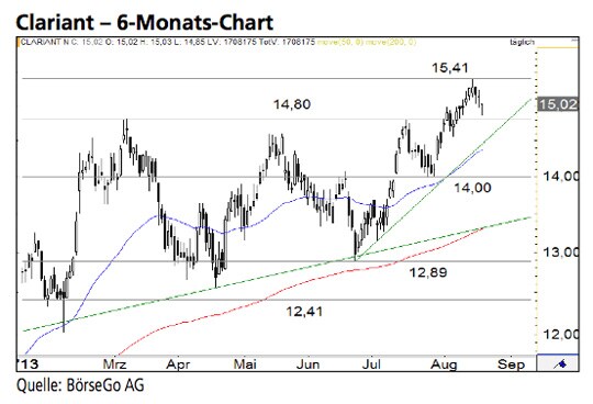 Der Anstieg über die Marke von 15,00 CHF wurde zuletzt korrigiert und der ehemalige Widerstand als neue Unterstützung bestätigt. Damit könnte sich die übergeordnete Rallybewegung bei den Aktien von Clariant problemlos fortsetzen. Die Long-Szenarien: Die am gestrigen Tag auf Candlestickbasis ausgebildete Hammerkerze könnte im Idealfall für die Bullen bereits den Tiefpunkt der mehrtägigen Konsolidie- rungsbewegung anzeigen. Damit könnten die Bullen einen weiteren Kaufimpuls initiieren, der den Wert zunächst zurück zum Zwischenhoch bei 15,41 CHF führen sollte. Mit einem An- stieg über diese Hürde würden die Käufer Stärke zeigen und den übergeordneten Aufwärtstrend nochmals unterstreichen. Das nächste Ziel in Form eines Zwischenhochs liegt in diesem Fall bei 16,83 CHF. Kann der Wert auch diese Marke hinter sich lassen, wartet erst bei 18,60 CHF in Form des langfristigen Abwärtstrends wieder eine nennenswerte Barriere. Die Short- Szenarien: Kurse unter 14,80 CHF könnten zu einem Test der Aufwärtstrendlinie bei 14,50 CHF führen. Geht es auch darunter, dürfte sich die Konsolidierung weiter ausdehnen und die Marke von 14,00 CHF ins Visier der Bären rücken. Langfristige Short-Signale würden hingegen erst entstehen, sollten die Aktien auch die Kreuzunterstützung bei 12,20 CHF aufgeben.