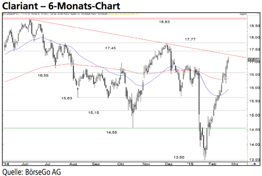 Rückblick: Nach einem grossen Doppelhoch bei 18,83 CHF endete bei den Aktien von Clariant im Juni 2014 ein mehrmonatiger Aufwärtstrend und mit dem Bruch der Unterstützung bei 16,55 CHF ging der Wert nahtlos in eine Abwärtsbewegung über.