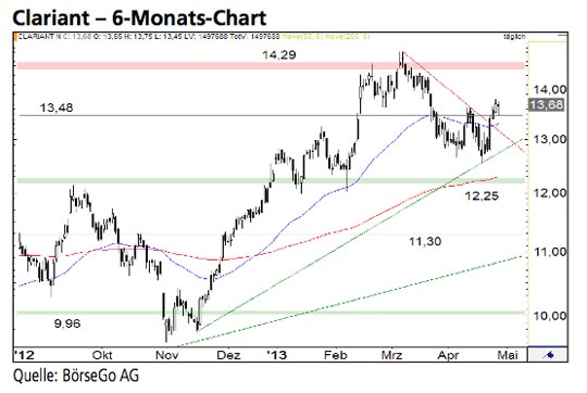 Die Aktien von Clariant scheinen den kurzfristigen Abwärtstrend der letzten Tage beendet zu haben. Die Auf- wärtsdynamik des jüngsten Kaufimpulses legt bereits jetzt die Fortsetzung der Hausse nahe. Die Long-Szenarien: Oberhalb von 13,48 CHF könnte sich der bullishe Gegenschlag fortsetzen und zu einem Anstieg über die kleine Hürde bei 14,00 CHF führen. Wird diese Marke gebrochen, stünden der Widerstand bei 14,29 CHF und das Verlaufshoch bei 14,81 CHF auf der Agenda. Ein nachhaltiger Ausbruch über diese Kurszone würde die Aktien unmittelbar in den übergeordneten Aufwärtstrend zurückführen. Entsprechend dürfte ein solches Kaufsignal zu einem Anstieg bis 15,50 und 16,00 CHF führen. Die Short-Szenarien: Sollte der Wert dagegen unter 13,48 CHF zurückfallen, könnte bereits bei 13,00 CHF ein weiterer Kaufimpuls einsetzen. Erst darunter wäre mit einer Ausweitung der Korrektur und Abgaben bis 12,25 CHF zu rechnen. Wird die- se Haltemarke jedoch gebrochen, dürfte ein Ausverkauf bis 11,30 CHF folgen und ein kleines Verkaufssignal auslösen.