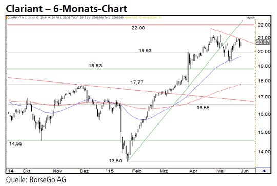 Rückblick: Nachdem die Aktien von Clariant im November 2014 an der Widerstandsmarke bei 17,77 CHF gescheitert waren, setzte ein Abwärtsimpuls ein, der bis Ende Januar andauerte und erst bei 13,50 CHF gestoppt wurde.