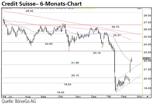 Rückblick: Nachdem die Aktien von Credit Suisse im Mai 2014 die Kreuzunterstützung bei 26,70 CHF unterschritten hatten, setzte sich eine mittelfristige Korrekturbewegung fort und drückte den Wert bis Oktober vergangenen Jahres an die wichtige Haltemarke bei 23,16 CHF.