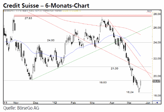 Ausblick: Die Aktien von Credit Suisse bleiben nach unserer Auffassung massiv angeschlagen. Die aktuelle Aufwärtskorrektur dürfte bereits bei 19,53 CHF verpuffen. Die Short-Szenarien: Nach einem bearishen Rücklauf an die ehemalige Unterstützung bei 19,53 CHF dürften die Aktien erneut auf das Tief bei 18,24 CHF zurückfallen. Doch selbst ein Anstieg über 19,53 CHF könnte bereits bei 20,00 bis 20,50 CHF abgebremst und der Wert weiter ausverkauft werden. Ein Unterschreiten der 18,24 CHF-Marke würde im Anschluss für weitere Verkaufswellen sprechen. Diese dürften die Aktien der Credit Suisse zunächst bis 17,20 CHF einbrechen lassen. Auf mittlere Sicht könnte der Wert aus unserer Sicht weiteres Abwärtspotential bis 16,50 CHF haben. Die Long-Szenarien: Erst ein signifikanter Ausbruch über den Kreuzwiderstand bei 21,00 CHF würde derzeit für eine nachhaltige Erholung sprechen. In diesem Fall wäre die steile Abwärtstrendlinie überschritten. Entsprechend könnte der Wert kurzfristig weiter bis 23,20 und 24,00 CHF steigen. An dieser massiven Hürde müsste jedoch mit einem Ende der Erholung und einer Wiederaufnahme des übergeordneten Abwärtstrends gerechnet werden.