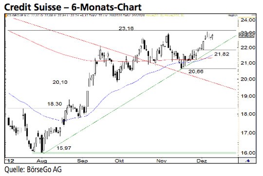 Ein Anstieg über 23,16 CHF würde aus unserer Sicht zunächst ein mittelfristiges Kaufsignal liefern und für einen weiteren mehrwöchigen Anstieg sprechen. Von einer langfristigen Trendwende ist der Wert dennoch weit entfernt. Die Long-Szenarien: Brechen die Aktien über 23,16 CHF aus, dürfte es auf kurze Sicht zu einem Aufwärtsimpuls bis 24,50 CHF kommen. Auf diesem Niveau wäre mit einer vorüber- gehenden Korrektur bis 23,10 CHF zu rechnen, ehe sich der Aufwärtstrend bis 25,50 CHF und darüber bis zum langfristig wichtigen Widerstand bei 27,63 CHF fortsetzen dürfte. Doch erst ein Ausbruch über diese Marke wäre ein deutliches Signal für das Ende des langfristigen Abwärtstrends der Aktien. Die Short-Szenarien: Sollte den Bullen der Ausbruch dagegen misslingen, kann eine Korrektur bis zur Unterstützung bei 21,82 CHF einsetzen. Von dieser Marke aus könnte ein weiterer Ausbruchsversuch starten. Fällt der Wert dagegen unter 21,82 CHF zurück, wäre der jüngste Anstieg von den Bären erfolgreich abgebremst worden und ein Rücksetzer bis 20,66 und 20,10 CHF wahrscheinlich. Doch selbst von dort könnte ein neuerlicher Anstieg einsetzen. Würde dagegen auch die zentrale Unterstützung bei 20,10 CHF durchbrochen, könnte ein Ausverkauf bis 18,30 CHF zurückführen.