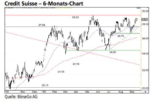 Der Aufwärtstrend der Aktien ist aus unserer Sicht weiterhin intakt. Ausserdem besitzt er aktuell die nötige Auf- wärtsdynamik, um den Wert über das Jahreshoch antreiben zu können. Die Long-Szenarien: Sollten die Bullen den Widerstand bei 29,32 CHF auf Tagesschlusskursbasis durchbrechen, wäre ein mittelfristiges Kaufsignal aktiviert. In der Folge dürfte der Wert zunächst bis 31,50 CHF ansteigen. Bei einem Ausbruch über diese Hürde könnten die Aktien auf mittlere Sicht bereits bis 33,74 CHF haussieren. Selbst eine Ausweitung der Rally bis an den Widerstand bei 36,88 CHF wäre in der Folge des Kaufsignals denkbar. Die Short-Szenarien: Sollten die Aktien dagegen an der Barriere scheitern, könnte es ausgehend von der Unterstützung bei 26,70 CHF zu einem weiteren Angriff auf das Verlaufshoch kommen. Würde diese Marke dagegen durchbrochen, wäre ein kleines Verkaufssignal aktiv. In der Folge wäre mit einem mehrtägigen Ausverkauf bis zur Haltemarke bei 24,50 CHF zu rechnen, ehe sich der Wert auf diesem Niveau stabilisieren sollte. Unterhalb dieser Marke wären dagegen Verluste bis 21,56 CHF wahrscheinlich.