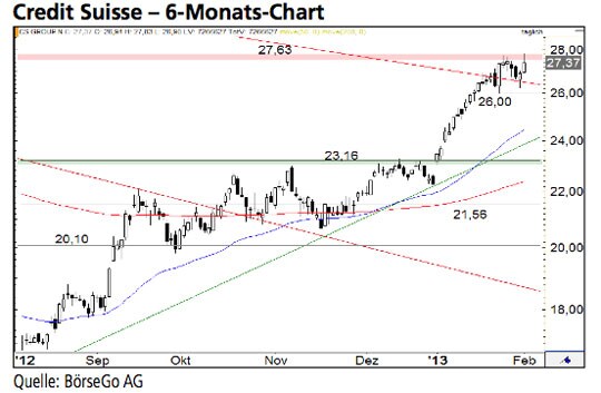 Die enorme Kaufwelle der letzten Wochen legt eine kurzfristige Konsolidierungsphase in den nächsten Handelsta- gen nahe. Dennoch ist der Aufwärtsdrang der Aktien weiter- hin exorbitant und könnte umgehend in einen Ausbruch über 27.63 CHF münden. Die Long-Szenarien: Sollten die Bullen den Widerstand bei 27,63 CHF direkt überwinden, könnte sich die laufende Kaufwelle bis 28,50 CHF fortsetzen. An dieser Stelle wäre mit einem Rücklauf an die Ausbruchsmarke zu rechnen. Im Anschluss könnte sich die Hausse oberhalb der damit gebrochenen langfristigen Abwärtstrendlinie bis 30,50 CHF ausdehnen. Auf mittlere Sicht wäre bereits ein Anstieg bis 31,83 CHF denkbar. Die Short-Szenarien: Scheitern die Käufer dagegen an der Barriere bei 27,63 CHF, könnte es zunächst zu einer leichten Korrektur bis 26,00 CHF kommen. Würde diese Unterstützung durchbrochen, dürfte sich die Gegenbewegung bis zur mittelfristigen Aufwärtstrendlinie auf Höhe von 25,00 CHF ausdehnen. Auf diesem Niveau dürften die Bullen jedoch wieder in den Wert zurückkommen und eine Fortsetzung des Aufwärtstrends einleiten. Erst ein nachhaltiger Ausverkauf unter die 25,00 CHF-Marke wäre im aktuell bullishen Umfeld negativ zu werten. In der Folge dürfte der Wert bis zur markanten Unterstützung bei 23,16 CHF zurücksetzen.