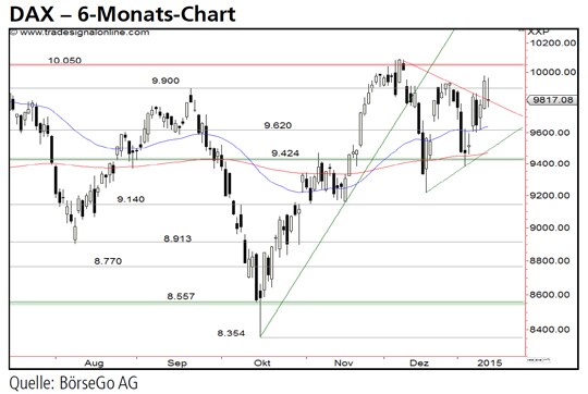 Rückblick: Nachdem der DAX Index Anfang Dezember mit 10.093 Punkten ein neues Allzeithoch markiert hatte, ging der Index in eine dreiecksförmige Korrektur über, in deren Verlauf er Anfang Januar bis an die Unterstützung bei 9.424 Punkten eingebrochen war.