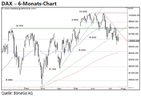 Rückblick: Der DAX Index ist nach einem wochenlangen Anstiegseit Anfang Juli deutlich unter Druck geraten und fielunter die Unterstützung bei 9.794 Punkten zurück.