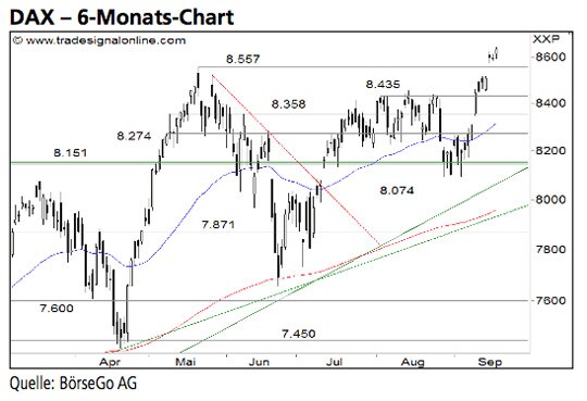 Rückblick: Zum Wochenauftakt übersprang der DAX Index sein vorheriges Allzeithoch bei 8.557 Punkten mit einem Aufwärtsgap und setzte damit den...