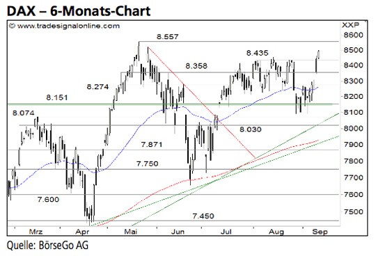 Der Konter der Bullen hätte kaum dynamischer ausfallen können. Mit diesem Aufwärtsimpuls hat der DAX den Seitwärtsmarkt der letzten Wochen überwunden und könnte jetzt rasch an das Allzeithoch ansteigen. Die Long-Szenarien: Verbleibt der Index über der Unterstützung bei 8.358 Punkten, dürfte es zu einer Fortsetzung der Aufwärtsbewegung bis zur 8.557 Punkte-Marke kommen. An dieser Stelle könnten kurzfristige Gewinnmitnahmen belasten. Ein anschliessender Ausbruch über die Rekordmarke hätte jedoch ein weiteres Kaufsignal und einen Anstieg bis 8.650 Punkte zur Folge. Selbst eine Ausweitung der Hausse bis 8.730 Punkte wäre in diesem Fall möglich. Die Short-Szenarien: Oberhalb der Haltemarke von 8.358 Punkten ist der Index aus unserer Sicht klar bullish zu werten. Wird die Unterstützung dagegen unterschritten, würde das Aufwärtsgap vom 10.09. geschlossen. Nach einer kurzen Korrektur bis 8.274 Punkte könnte der Wert jedoch erneut in Richtung der 8.435 Punkte-Marke haussieren. Erst ein Bruch der Unterstützung bei 8.274 Punkten würde den DAX unter Druck bringen und einen Ausverkauf bis 8.074 Punkte auslösen.