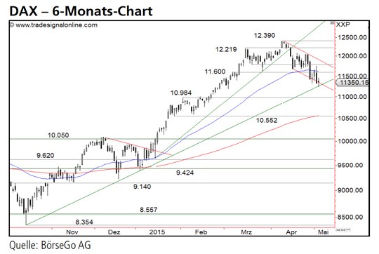 Rückblick: Nach dem Erreichen eines neuen Allzeithochs ebbte Mitte April die massive Kaufwelle beim DAX Index zusehends ab und der Index brach unter die Unterstützung bei 12.219 Punkten ein.