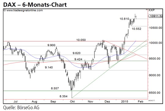 Rückblick: Nachdem der DAX Index Mitte Januar aus einer bullishen Dreiecksformation ausgebrochen und über das bisherige Allzeithoch bei 10.093 Punkten angestiegen war, gab es für die Käufer kein Halten mehr: