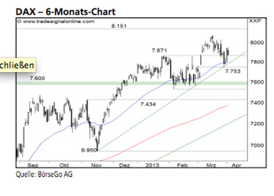 Rückblick: Von Mitte November 2012 bis Mitte März 2013 stieg der DAX Index in einer steilen Kaufwelle in Richtung seines Allzeithochs bei 8.151 Punkten. In der Spitze erreichte der Wert 8.074 Punkte, ehe es zu einer korrektiven Gegenbewegung kam.