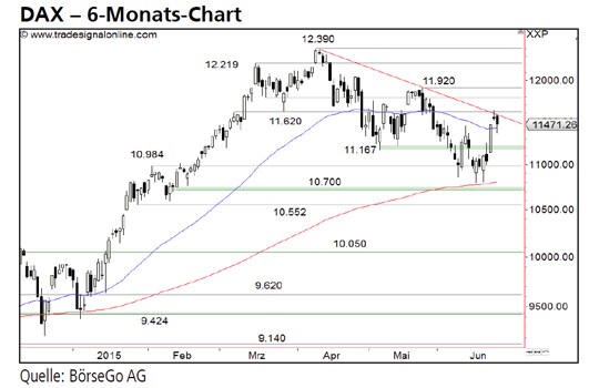 Ausblick: Der DAX steht nach dem steilen Anstieg der letzten Tage kurz vor einem Kaufsignal. Nach dem Ende der laufenden Korrektur dürfte dieser Ausbruch aus unserer Sicht erfolgen. Die Long-Szenarien: Zunächst ist mit einer weiteren Abwärtsbewegung bis in den Bereich um 11.167 Punkte zu rechnen, ehe der Index dort den steilen Kaufimpuls der letzten Tage fortsetzen dürfte. Bei einem nachhaltigen Ausbruch über die 11.620 Punkte-Marke wäre ein Kaufsignal aktiv und ein Anstieg bis 11.920 Punkte die Folge. An dieser Hürde sollte man sich auf eine deutliche Gegenbewegung einstellen. Bricht der DAX anschliessend jedoch auch über diese massive Barriere aus, stünde ein mittelfristiger Anstieg an das Allzeithoch auf der Agenda. Die Short-Szenarien: Setzt der Index unter die 11.167 Punkte-Marke zurück, wäre dies jedoch ein deutliches Zeichen für Schwäche. In der Folge müsste man den jüngsten Anstieg in Frage stellen. Abgaben bis 10.984 Punkte und darunter bereits bis 10.700 Punkte wären in diesem Fall kaum mehr zu vermeiden.