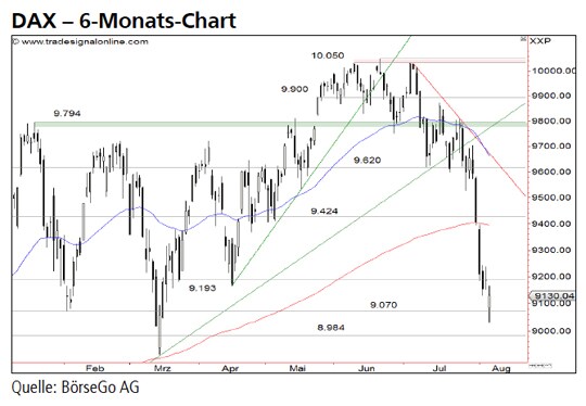 Ausblick: Aktuell versuchen die Käufer eine leichte Erholung im Bereich von 9.100 Punkten einzuleiten. Die verheerende Wirkung des jüngsten Ausverkaufs dürfte jedoch weiter belasten. Die Short-Szenarien: Nach einem kurzen Wiederanstieg in Richtung der 9.194 Punkte-Marke könnte bereits der nächste Kurseinbruch folgen und den Index an die Unterstützung bei 8.984 Punkten drücken. Darunter könnte es zu einem Test des Tiefs vom März dieses Jahres bei 8.913 Punkten kommen. Allerdings ist der Wert derzeit stark überverkauft, womit spätestens an dieser Stelle mit einer steilen Erholung zu rechnen wäre. Die Long-Szenarien: Kann der DAX dagegen über die 9.193 Punkte- Marke ansteigen, würde sich die Erholung bis 9.243 Punkte fortsetzen. Oberhalb dieser kleinen Widerstandsmarke käme es zu einem Anstieg bis 9.350 Punkte. Allerdings wäre an dieser Stelle wieder mit einem Eingreifen der Bären und einem weiteren Ausverkauf in Richtung 9.100 Punkte zu rechnen. Sollte es der Käuferseite dagegen gelingen, den Index über diese Hürde anzutreiben, könnte sich die Gegenbewegung bis 9.424 Punkte ausdehnen. Der seit Anfang Juli dominierende Abwärtstrend wäre damit jedoch nicht in Frage gestellt.
