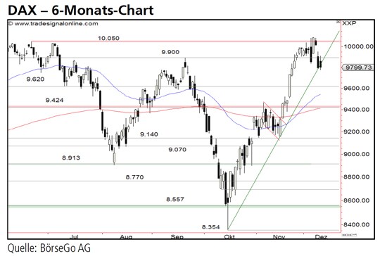 Ausblick: Aktuell notiert der DAX wenige Punkte über der steilen, seit Oktober federführenden Aufwärtstrendlinie. Deren Bruch spräche jetzt für die Fortsetzung der kurzfristigen Korrektur. Die Long-Szenarien: Zwar könnte es zunächst zu einem Anstieg in Richtung 9.950 Punkte kommen, doch dürfte der DAX die Gegenbewegung anschliessend fortführen. Bei einem Unterschreiten der Trendlinie wäre mit einer scharfen Abwärtsbewegung zu rechnen, die durchaus bis 9.620 Punkte zurückführen kann. Diese Unterstützung sollte von der Käuferseite jedoch für eine Stabilisierung und einen anschliessenden Anstieg genutzt werden können. Bei einem Ausbruch über 9.950 Punkte würde das Rekordhoch bei 10.093 Punkten ein weiteres Mal angegriffen. Die Short- Szenarien: Solange der Index über der 9.620 Punkte-Marke notiert, ist der Aufwärtstrend uneingeschränkt intakt und ein Ausbruch auf neue Höchststände jederzeit möglich. Wird die Unterstützung dagegen durchbrochen, käme es zu einem deutlichen Rückfall bis an die Haltemarke bei 9.424 Punkten. Wird dieser Preisbereich nicht für eine Bodenbildung genutzt, ist ein Ausverkauf bis 9.140 Punkte wahrscheinlich.
