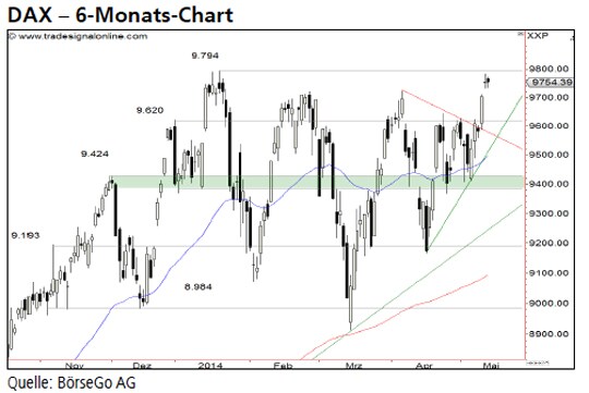 Rückblick: Ausgehend von der Unterstützung bei 9.193 Punkten stieg der DAX Index seit Mitte April an den markanten Widerstand bei 9.620 Punkten.