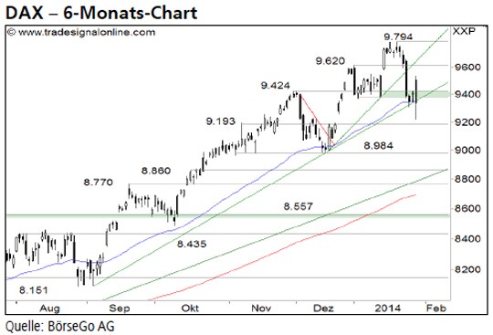 Rückblick: Bis Mitte Januar zog der DAX Index in einer steilen Kaufwelle über den Widerstand bei 9.620 Punkten an und erreichte ein neues Allzeithoch bei 9.794 Punkten.
