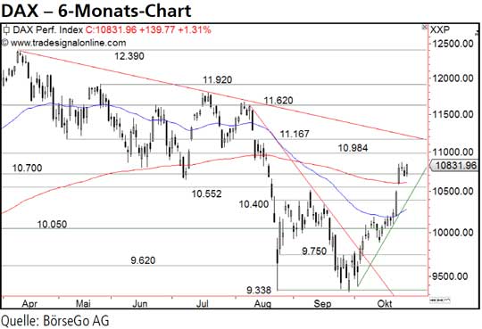 Rückblick: Die ohnehin schon steile Erholung des DAX Index, die Ende September bei 9325 Punkten gestartet war, setzte sich seit dem vergangenen Donnerstag fulminant fort: In einer hochdynamischen Kaufwelle übersprang der Index zuerst die Barriere 10'552 Punkten und aktivierte damit ein Kaufsignal.